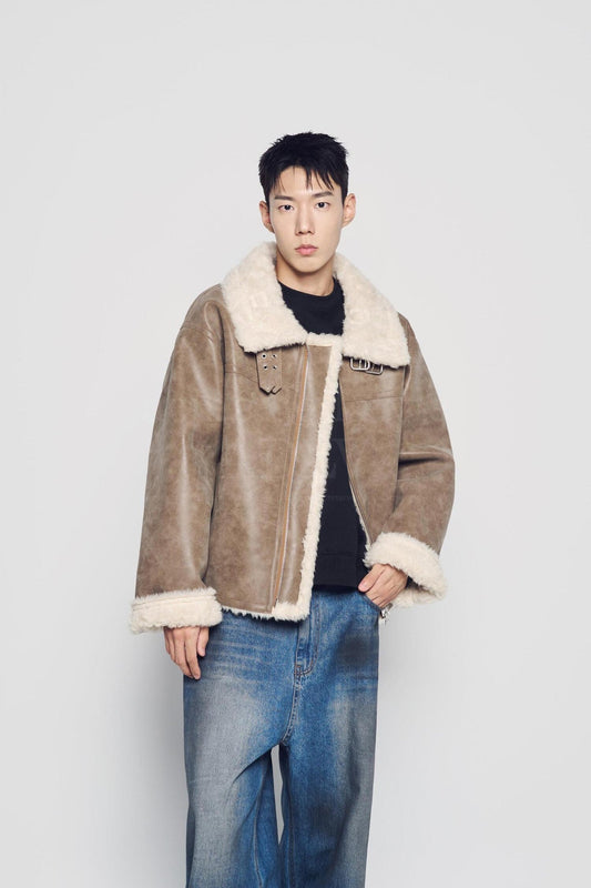 [SEVENTEEN] HIGHNECK VINTAGE CRACK VEGAN LEATHER MOUTON JACKET OFFICIAL MD
